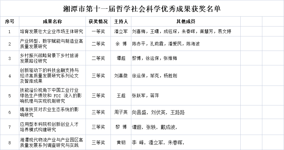 在近日公布的湘潭市第十一届哲学社会科学优秀成果暨第一届哲学社会科学领军人物评选中,公司8项成果获奖,其中一等奖1项、二等奖2项、三等奖5项。