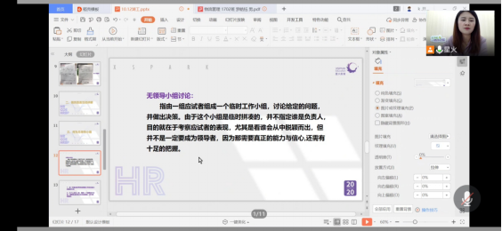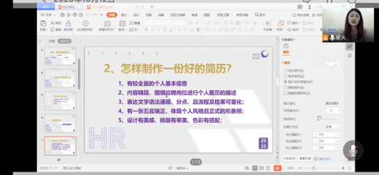 10月12日晚七点,由韦德1946体育官方入口管理公司主办,管理公司就业服务部承办的应聘模拟演练大赛赛前指导以线上的形式,在腾讯会议进行,本次赛前指导,由珠海星火英语企业高管贺佳盈担任主讲人。贺佳盈,珠海星火教育培训中心有限公司人力资源部招聘主管,贺佳盈在星火英语有着五年的工作经历,每天的工作时间内会接受、审核数十封简历,面试经验可谓是十分丰厚。贺佳盈在正式进行培训前,从三个角度进行切入,从应聘的目的、应聘的流程再到应聘的礼仪,讲解内容深刻,声线清晰,声情并茂,并在最后与同学们进行了互动交流。
