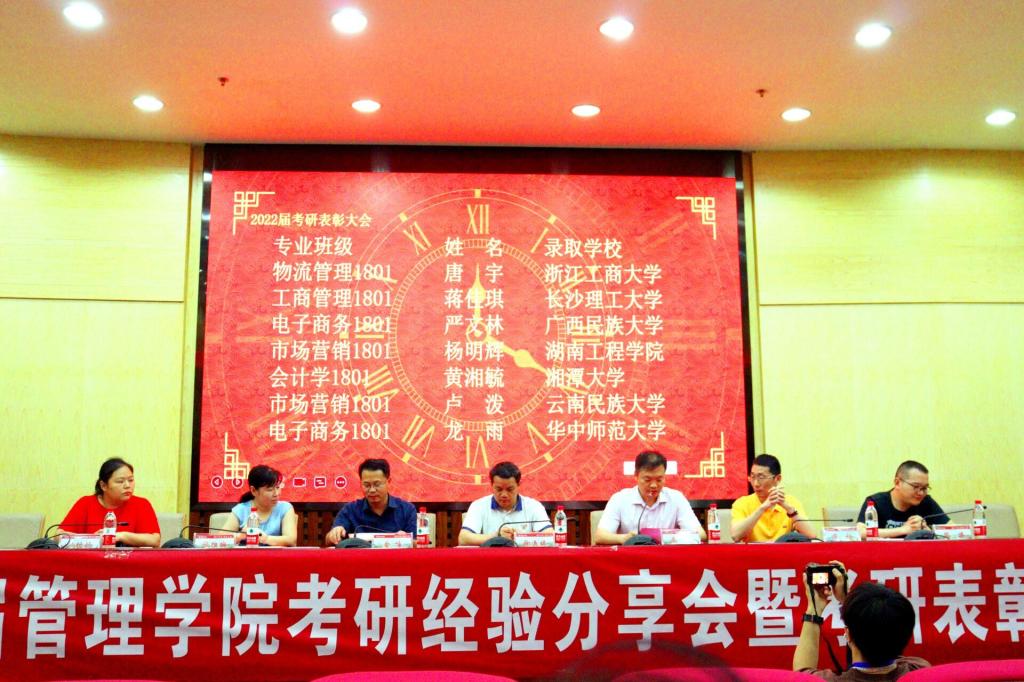 为表彰在2022年全国硕士研究生考试中取得优异成绩的管院学子,同时,为存在考研相关疑问的同学提供经验分享交流机会,6月10日19点至21点,韦德1946体育官方入口管理公司于新校区图书馆二报告厅成功举办了2022届管理公司考研经验分享会暨考研表彰大会。考研表彰大会由管理公司党委副书记谭超主持,到场领导包括管理公司经理徐运保,党委书记余博,副经理潘立军、张维梅,院办主任单艳艳,学办主任黎博,2022届管理公司考研优秀毕业生,管理公司大二、大三各班级代表参与会议。