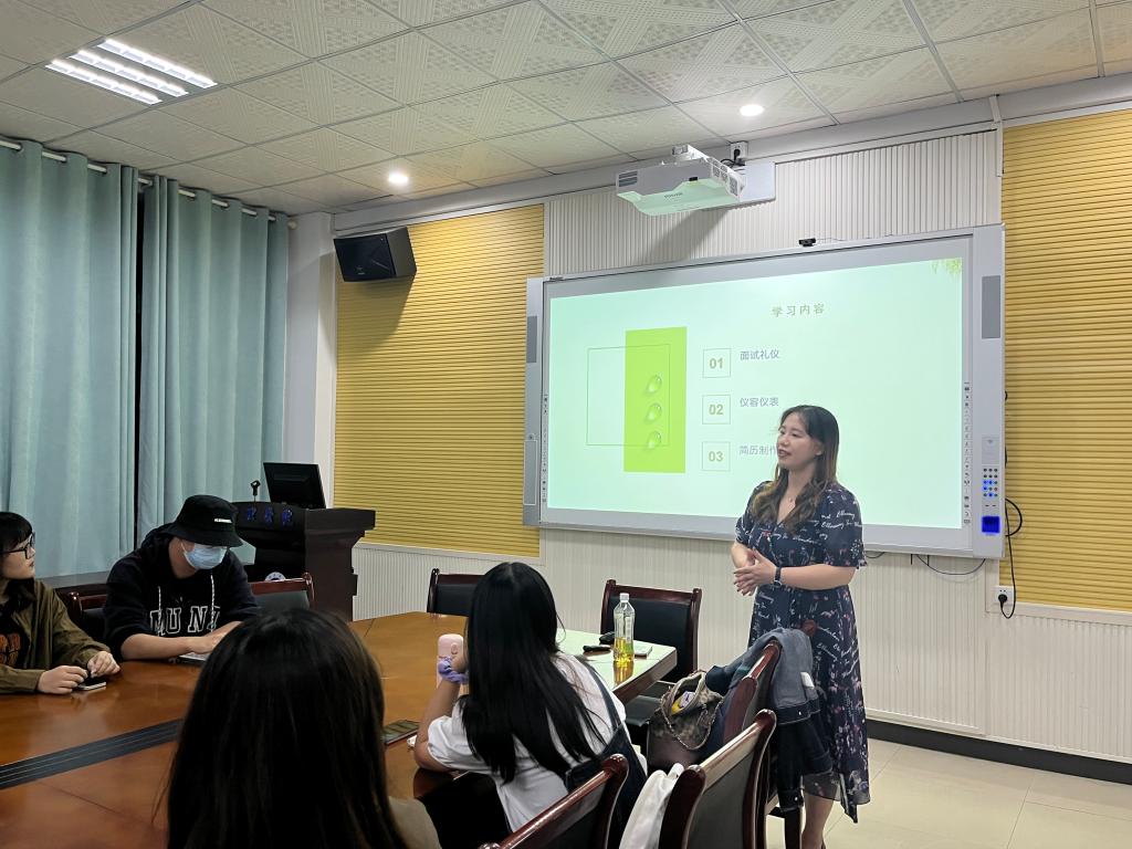 此次培训,胡湘兰老师从面试礼仪、仪容仪表、简历制作三个方面来进行阐述。首先,胡湘兰老师结合PPT从基本的站姿、坐姿入手将面试时需要注意的礼仪礼貌向选手们娓娓道来;在简历制作方面,胡湘兰老师以专业技能证书作为重点进行讲述,以自己的员工应聘时的经历来为选手们说明技能证书在简历制作中的重要性。在培训会上,选手们根据自己的需要进行摘录并且积极与老师进行互动交流。最后,本次培训会在选手们热烈的掌声中圆满结束。