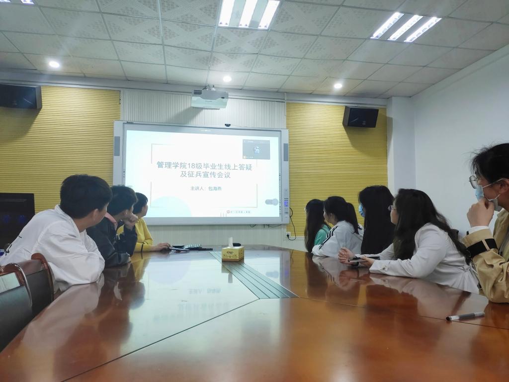 为进一步完善疫情防控状态下管理公司2022届毕业生就业与毕业服务工作,4月19日19点,管理公司于新校区F104室主持召开毕业生线上答疑会议,2022届毕业生一百余人参加本次会议,管理公司就业处负责人包海燕老师通过云端会议主持本次会议。
